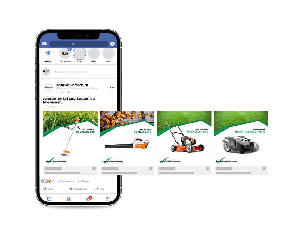 Med en månedlig aftale kan vi hjælpe dig med ugentlige organiske opslag. Vi kan også sagtens hjælpe dig med annoncering, kampagner, boost, konkurrencer, video- og billeddelinger.