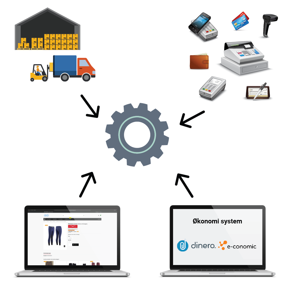 Vi kan skabe en tovejs API integration mellem webshop og økonomisystemet. Det betyder, at kunder kan varetage lagerændringer i f.eks. e-conomics, og dermed ned- eller opskrive lageret i webshop ved at sende data tilbage til webshop. Omvendt kan webshop også styre lageret, og dermed har du en lagerfunktion tovejs.